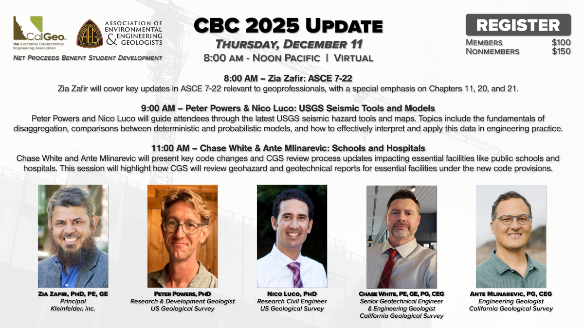 Members: $350 | Non-Members: $500 Prevailing Wage & Related Updates Practical and Tactical Solutions Sustainable and Climate-Resilient Slope Repair Technique DETAILS AI Meets Soil: Redefining Liquefaction Analysis with GeoLiquefy Hutchinson Island Ferry Bulkhead Collapse Induced Seismicity Hazard Assessment for the Energy Industry Geotechnical + Structural Engineers | Optimizing Project Planning Liquefaction Assessment of Gravelly Soils Based on In-Situ Testing Numerical Modeling 2025 (2 hours)